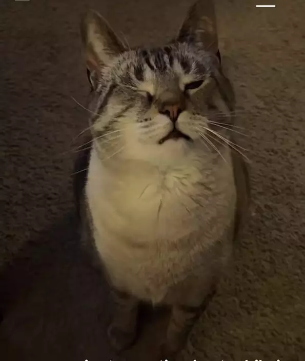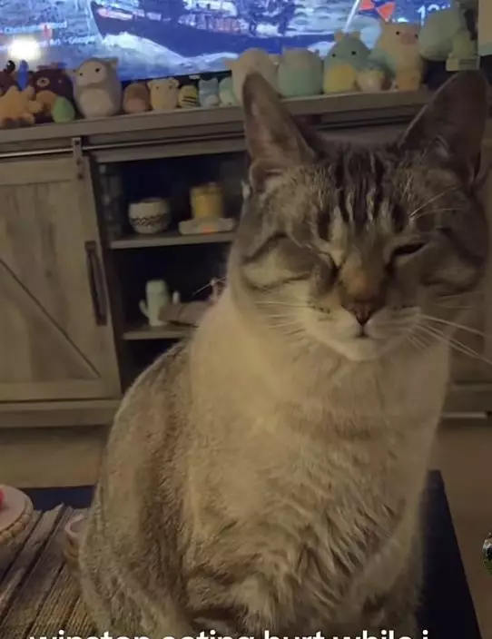 貪嘴虎斑貓見飼主食爆谷即「戲精上身」瞇眼扮受傷。TikTok圖片