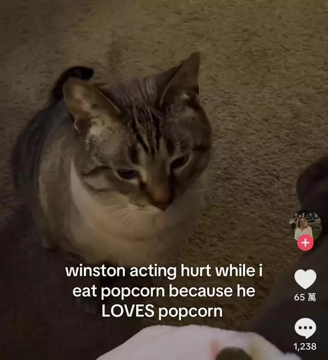 日前,國外一名飼主羅斯(Rose)於TikTok帳號「@ rosiee_mj」分享家中虎斑貓溫斯頓(Winston)的可愛反應,萌翻一眾網民。羅斯表示,每當他在梳化上準備進食爆谷時,溫斯頓便會「戲精上身」,刻意瞇起一隻眼睛裝作眼部不適,企圖博取同情分得爆谷,楚楚可憐的模樣,令人不禁心生憐憫。
