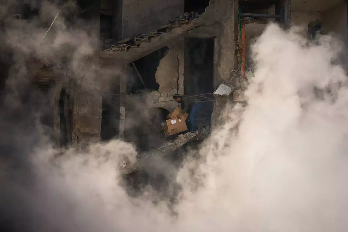 2026年4月9日周四,黎巴嫩貝魯特,一名男子從其遭以色列空襲摧毀的家中收拾物品。(美聯社圖片/埃米利奧·莫雷納蒂 Emilio Morenatti) AP圖片