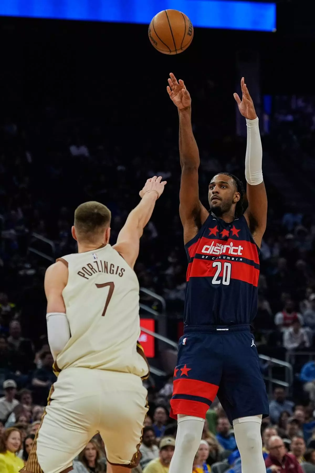 華盛頓巫師隊中鋒艾力士沙亞(20號)在2026年3月27日(周五)於三藩市舉行的一場NBA籃球賽上半場,射球越過金州勇士隊中鋒基斯塔普斯普辛基斯(7號)。(美聯社圖片/Godofredo A. Vásquez) AP圖片