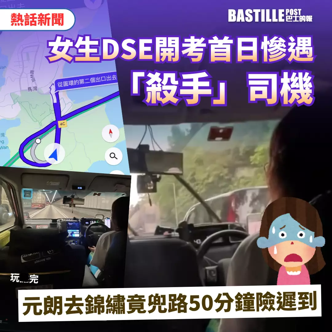 一名應屆中學文憑試(DSE)女考生,在開考首日(4月8日)經歷了一場驚心動魄的兜路事件。她從元朗出發前往錦綉花園的試場,原本僅需15分鐘的車程,但卻遇着一位不熟路的Uber女司機,慘變成近50分鐘的「新界半日遊」,沿路經過汀九橋、青衣甚至直踩入馬灣,讓她險些遲到,憤怒的心情隨即跌入絕望的谷底。