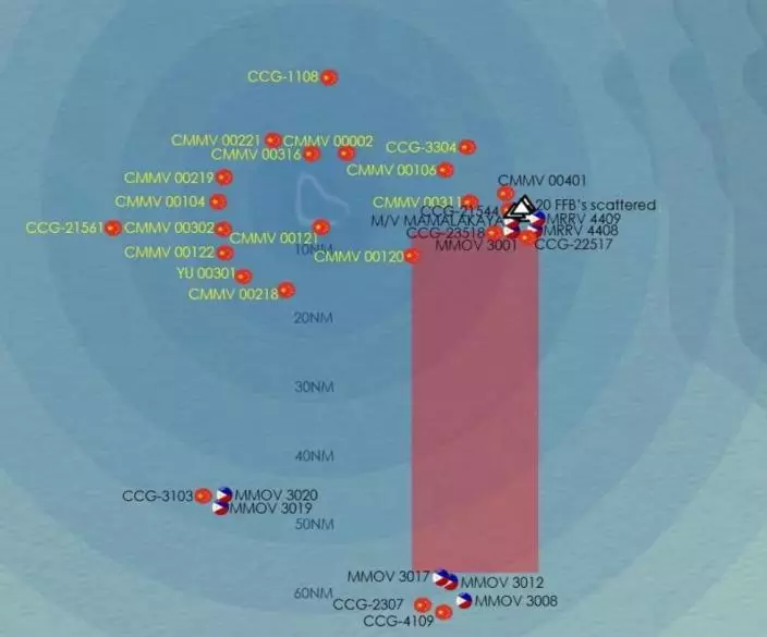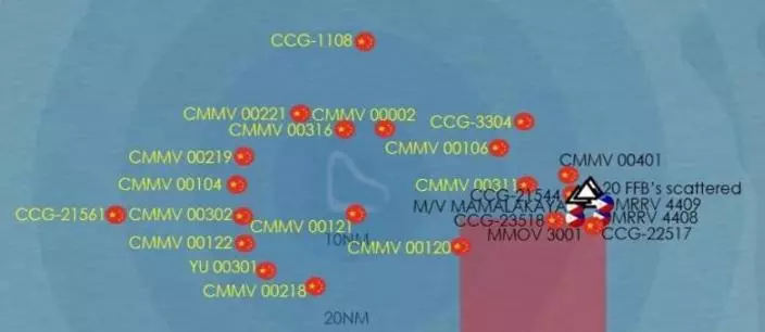 根據菲方的說法,他們在現場監測到了6艘中國海警船、20 艘中國民兵船、1艘中國海軍艦艇。其中,在黃岩島東部約30海里處,可以明顯看到4艘中方船隻正在與4艘菲律賓船隻持續對峙,中方死死釘在這一關鍵航道,堅決將菲方阻截在黃岩島30海里之外。而黃岩島東南部約60海里處、南部約40至50海里處,中方同樣也部署了海警船與民兵船,對後續趕來挑釁的菲方船隻實施前置攔截,封死其突破路徑。