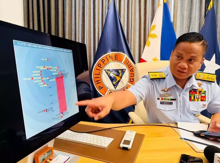 菲律賓海岸警衛隊發言人傑伊·塔里埃拉在記者會上指著監控畫面,說明中方此次清場行動的具體範圍與前所未有的執法力度。