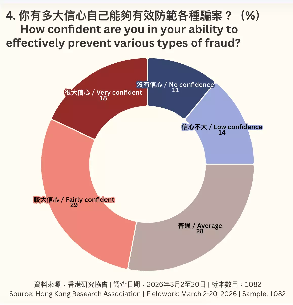 香港研究協會於3月2日至20日進行一項全港性隨機抽樣電話調查,成功訪問了1082名18歲或以上市民,以瞭解市民對騙案的防範意識。調查發現,近半市民對防範騙案有信心,但實際防騙知識仍有不足之處。