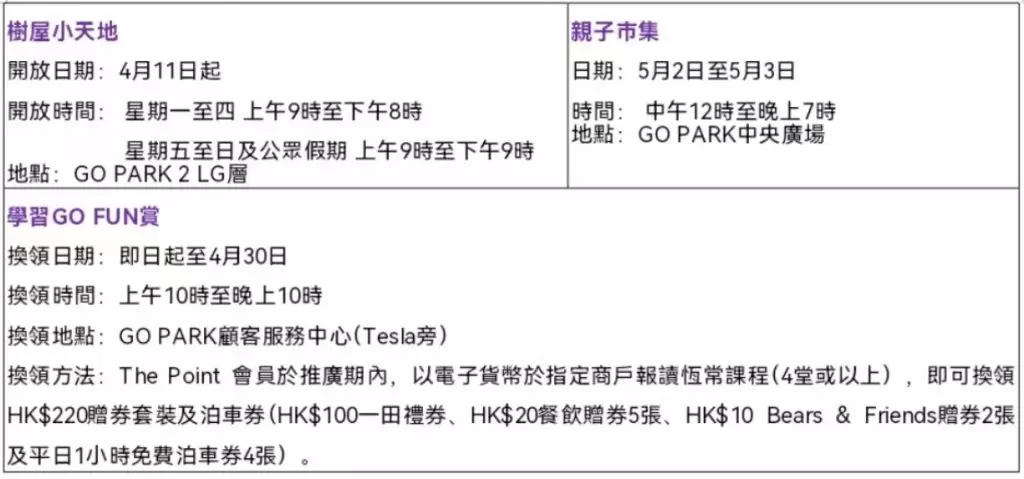 西沙GO PARK亦於同期特別推出「學習GO FUN賞」推廣活動,於即日起至4月30日期間,The Point 會員以電子貨幣報名恆常課程即送HK$220 一田及GO PARK餐飲贈券及平日免費泊車券。