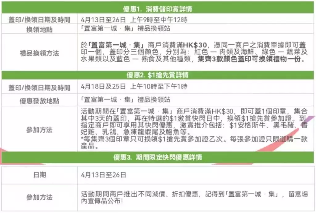 置富第一城 ‧ 集「鮮味第一城 $1蚊搶鮮餸」3大重磅着數加碼回歸,狂餸逾3000份禮品,超過5萬港元。