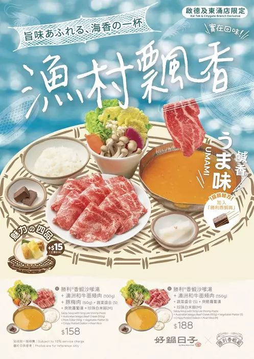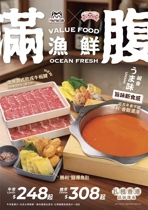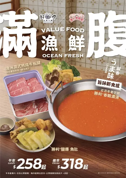 株式会社有限公司旗下三大人氣火鍋品牌:「牛涮鍋」(Mou Mou Club)、「好鍋日子」(Shabu Days) 及「好呷台灣火鍋」(#HAP Taiwanese Hotpot) ,攜手近百年歷史的大澳老字號「勝利香蝦廠」展開跨界合作,將大澳非物質文化遺產的「 蝦醬」及「蝦膏」工藝融入火鍋文化,推出期間限定聯乘餐目。
