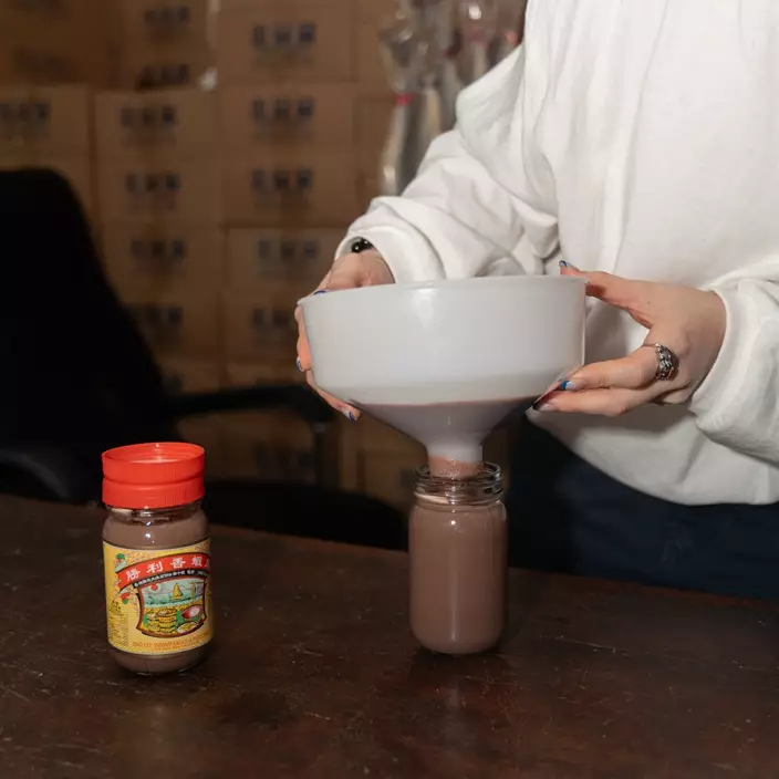 將細滑的蝦醬親手入樽並貼上標籤,打造一份獨一無二、飽含手作溫度的非遺伴手禮。