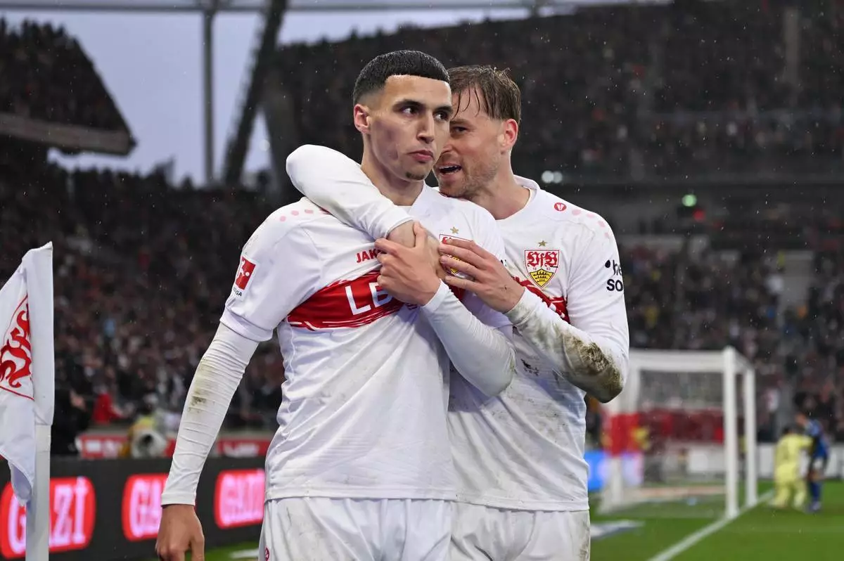2026年4月12日,德國史特加,史特加(Stuttgart)球員艾簡路斯(Bilal El Khannouss,左)與米圖斯達特(Maximilian Mittelstädt)慶祝射入球隊第四個入球。攝於德國甲組足球聯賽史特加對漢堡(Hamburger SV)的賽事。(美聯社圖片/Marijan Murat) AP圖片