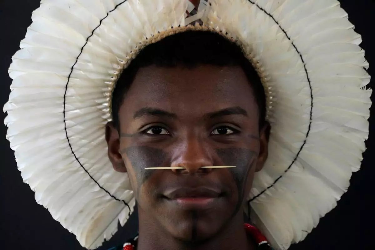 2026年4月8日周三,一名原住民男子在巴西利亞出席最高法院會議期間,望向鏡頭。法官在會上討論縮減賈曼辛國家公園面積的案件。(美聯社圖片/Eraldo Peres) AP圖片