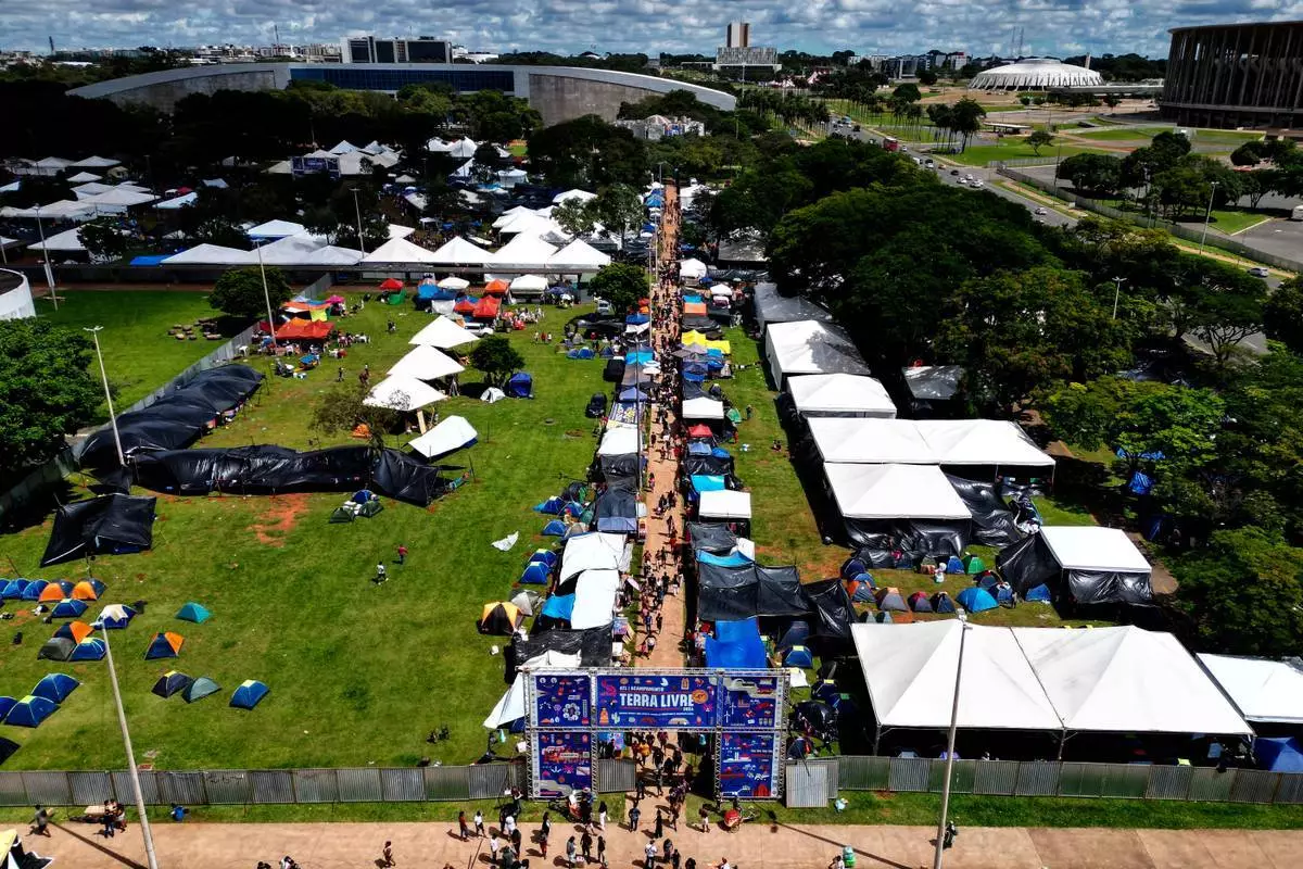 2026年4月6日周一,巴西利亞的「自由土地營地」現場,這是巴西最大規模的原住民年度動員活動,旨在爭取土地權利及環境保護。(美聯社圖片/Eraldo Peres) AP圖片