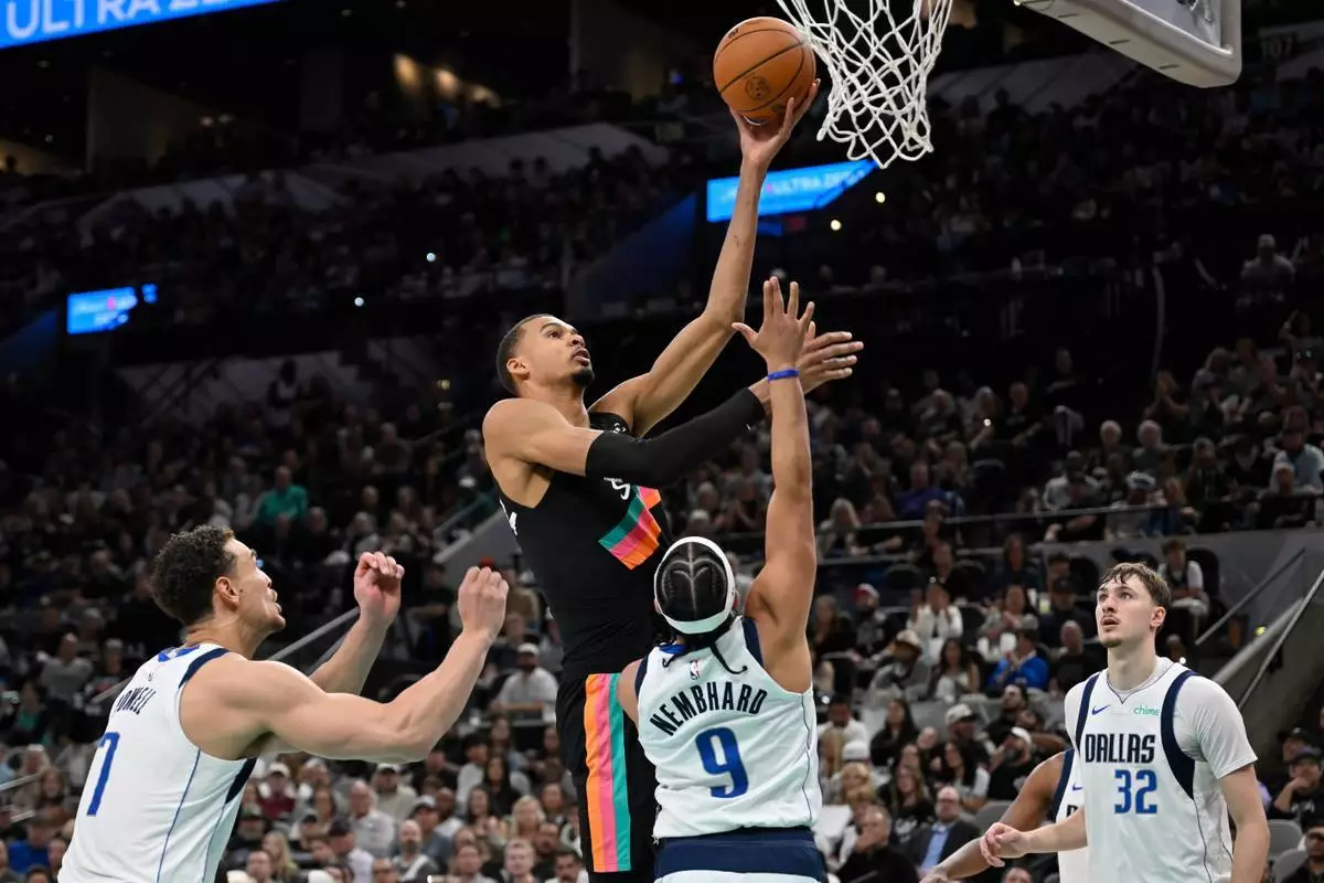 聖安東尼奧馬刺隊中鋒維克多·雲班耶馬(中上)在NBA籃球賽下半場(Second half)中,面對達拉斯獨行俠隊的賴恩·尼姆哈德(9號)、德懷特·鮑威爾(7號)和古柏·弗拉格(32號)上籃。攝於2026年4月10日周五,聖安東尼奧。(美聯社圖片/Darren Abate) AP圖片