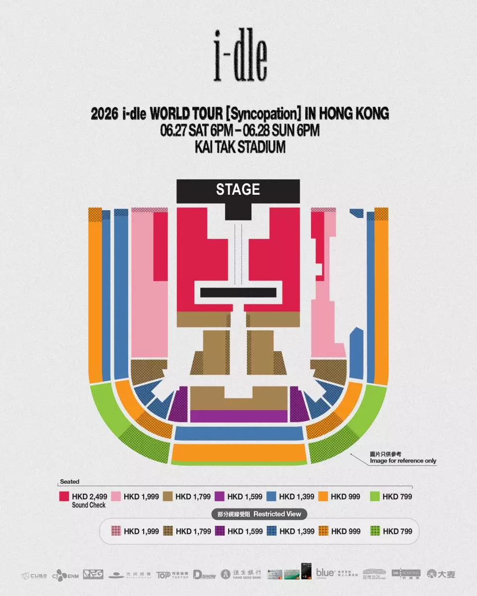 《2026 i-dle WORLD TOUR [Syncopation] IN HONG KONG》票價分為港幣$2,499、$1,999、$1,799、$1,599、$1,399、$999、$799,所有購買$2,499門票的觀眾將可參與演前彩排,獲得香港場專屬禮品一套,並享有優先入場資格。成功在2026年3月27日下午2時 至 2026年3月30日下午1時59分期間於Berriz登記的i-dle OFFICIAL FANCLUB NEVERLAND會員可於2026年4月21日中午12時至晚上6時經快達票(HK TICKETING)參與會員優先購票。恒生Mastercard信用卡優先購票將於2026年4月22日中午12時至晚上11時59分於快達票(HK TICKETING)進行。公開售票將於2026年4月23日中午12時透過快達票(HK TICKETING)及大麥(Damai)正式發售。
