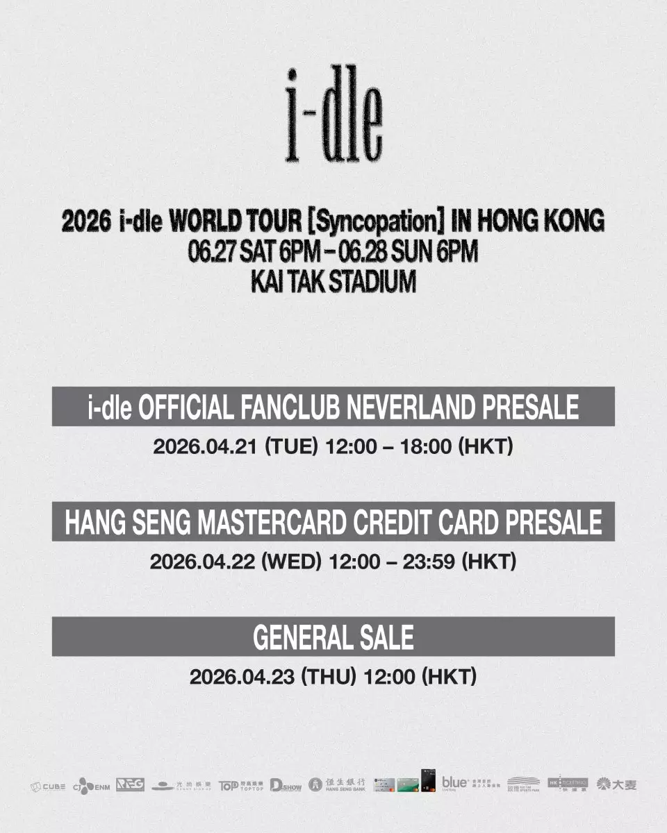 韓國人氣女團i-dle即將於2026年6月27日及28日假啟德主場館舉行演唱會 — 《2026 i-dle WORLD TOUR [Syncopation] IN HONG KONG》。這將是她們繼2024年8月來港舉行演唱會後,時隔兩年再度訪港開唱,踏上全港最大的演出場地—啟德主場館的舞台,令粉絲熱切期待。