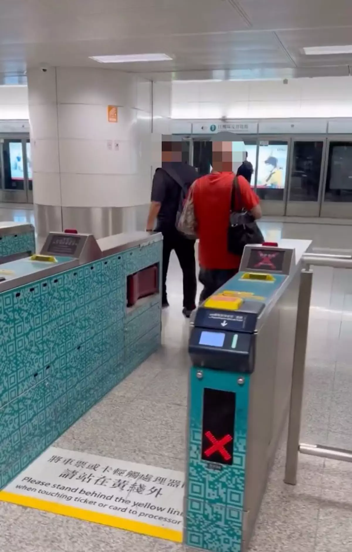 從影片中可見,一名身穿紅衣並戴著口罩的男子,在青衣港鐵站緊跟著前方一位黑衣男子入閘。紅衣男子雖然做出拍卡動作,但閘機隨即顯示紅色交叉圖示,證明並未成功付款便已進入站內。
