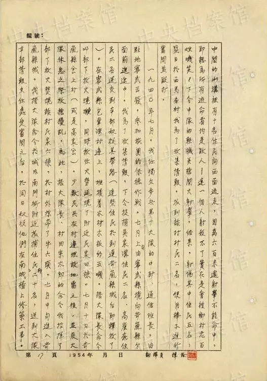 「我於1937年4月起至1945年9月3日止,參加日軍對中國人民所犯下的罪惡事實,統計於下:即殺人總數為831名。殺人對象內計:男住民420名,女住民14名,民兵98名,八路軍兵員252名,抗日軍兵員38名,俘虜兵員9名”。殺人手段計:射殺、刺殺、斬首、燒死、摔死、餓死、瘐死。」