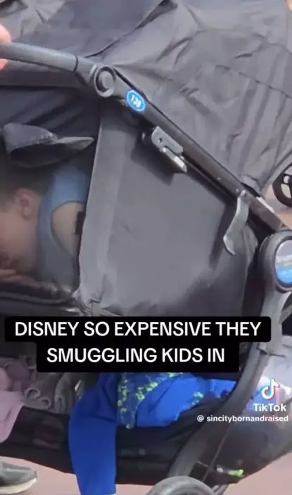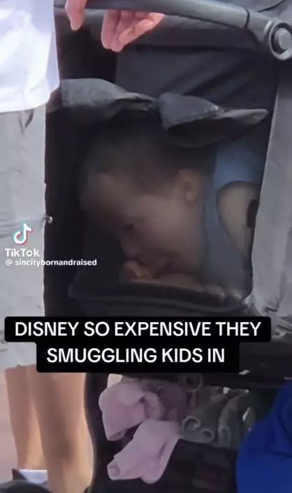 網傳畫面可見,當時大批遊客正排隊入園,其中一對夫婦所推的嬰兒車顯得異常,細看可以發現一名幼童正蜷縮於車後的置物袋內,臉部緊貼網狀布料,並靜靜啃食餅乾。影片配文寫道:「迪士尼票價太貴,他們竟把小孩偷渡進去」。