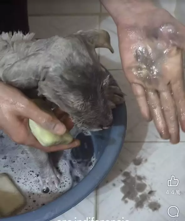 墨西哥一隻流浪幼犬因身上長期積聚污垢塵土導致毛髮呈灰紫色,沖淨後秒變純白色驚呆救援人員。