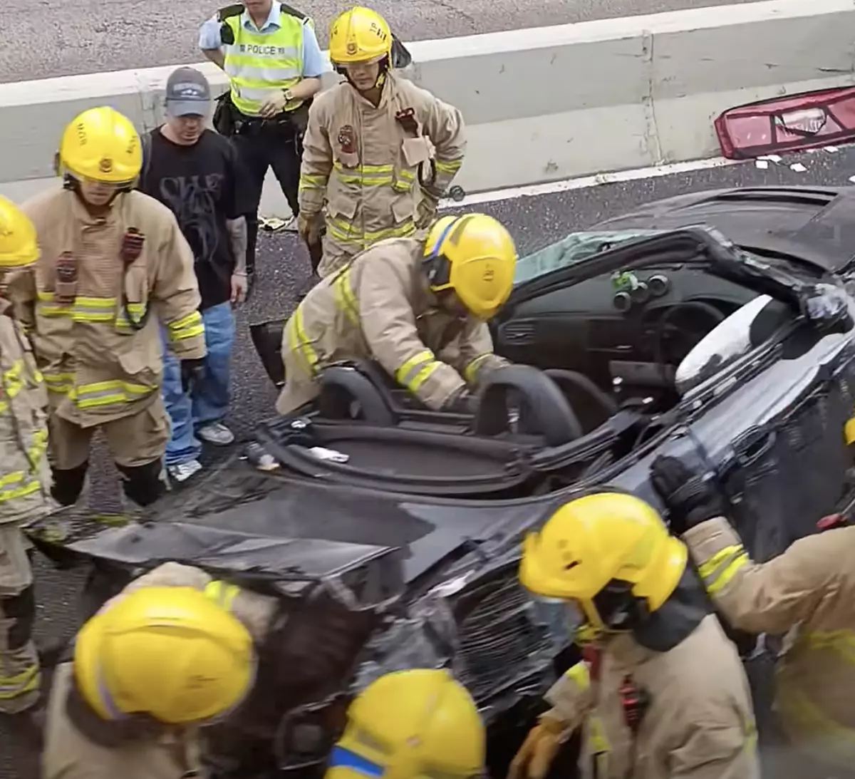 大埔公路交通意外,私家車損毀嚴重。FB影片截圖