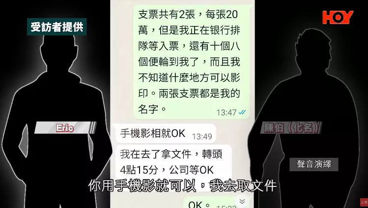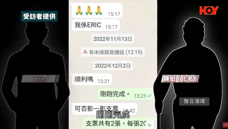 陳伯成功借得40萬港元後,對方即稱只差最後一步,扣除首期還款後,要求陳伯將餘下約38.7萬港元全數轉帳至Eric的公司。轉帳翌日,陳伯即因中風入院。記者事後發現其當時簽署的文件錯漏百出,中英文公司名不符。