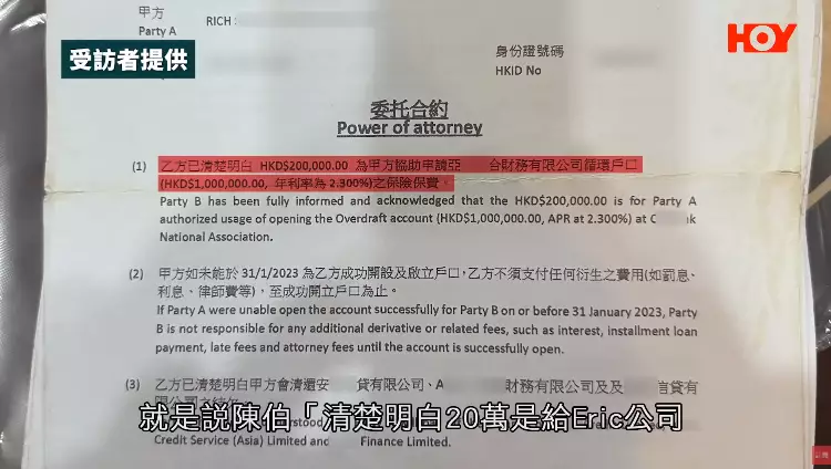 陳伯於2022年10月接獲自稱財務公司職員電話,遊說其借錢。陳伯因欲清還舊債及裝修,被轉介至中環德輔道中一間「會計師樓」。受訪陳伯指,當時由一名叫Eric的男子接待,要求他簽署授權書,委託該公司辦理貸款事宜。