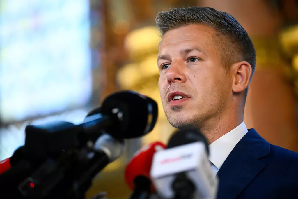 2026年4月12日周日,匈牙利布達佩斯,反對黨蒂薩黨領袖馬扎爾在匈牙利國會選舉投票結束後向傳媒發言。(美聯社圖片/Denes Erdos) AP圖片