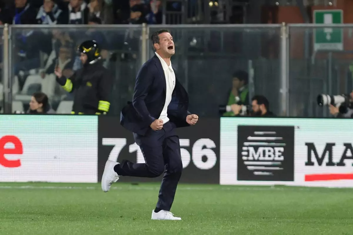 國際米蘭主教練基斯甸基奧(Cristian Chivu)在對陣科莫的意甲足球賽中慶祝,攝於意大利科莫,周日(2026年4月12日)。 (美聯社圖片/Antonio Saiai/LaPresse) AP圖片