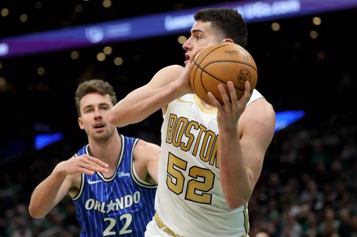 2026年4月12日周日,在波士頓舉行的一場NBA籃球賽上半場,波士頓塞爾特人前鋒加沙(Luka Garza,52號)防守奧蘭多魔術前鋒華格納(Franz Wagner,22號)的持球。(美聯社圖片/Mark Stockwell) AP圖片