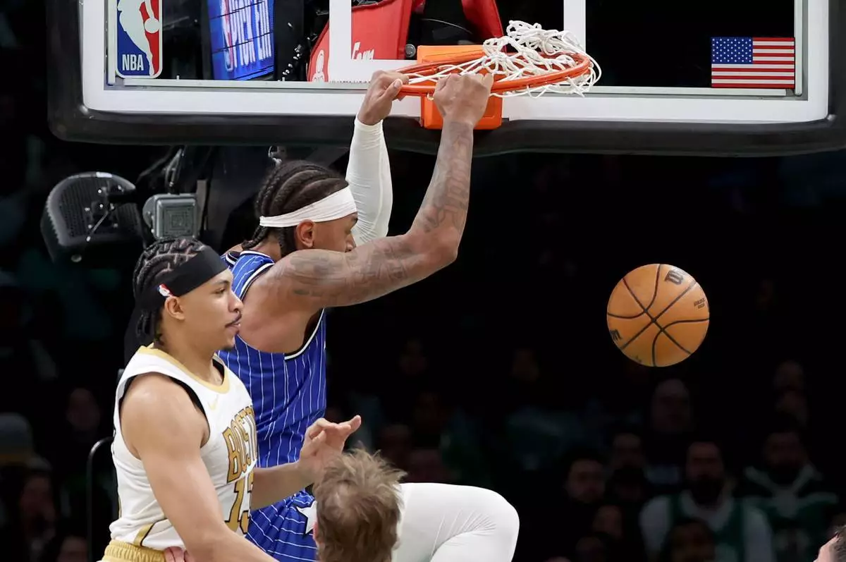 2026年4月12日周日,在波士頓舉行的一場NBA籃球賽上半場,奧蘭多魔術前鋒班捷羅(Paolo Banchero,右上)在波士頓塞爾特人前鋒朗夏柏二世(Ron Harper Jr.,左上)旁邊入樽。(美聯社圖片/Mark Stockwell) AP圖片