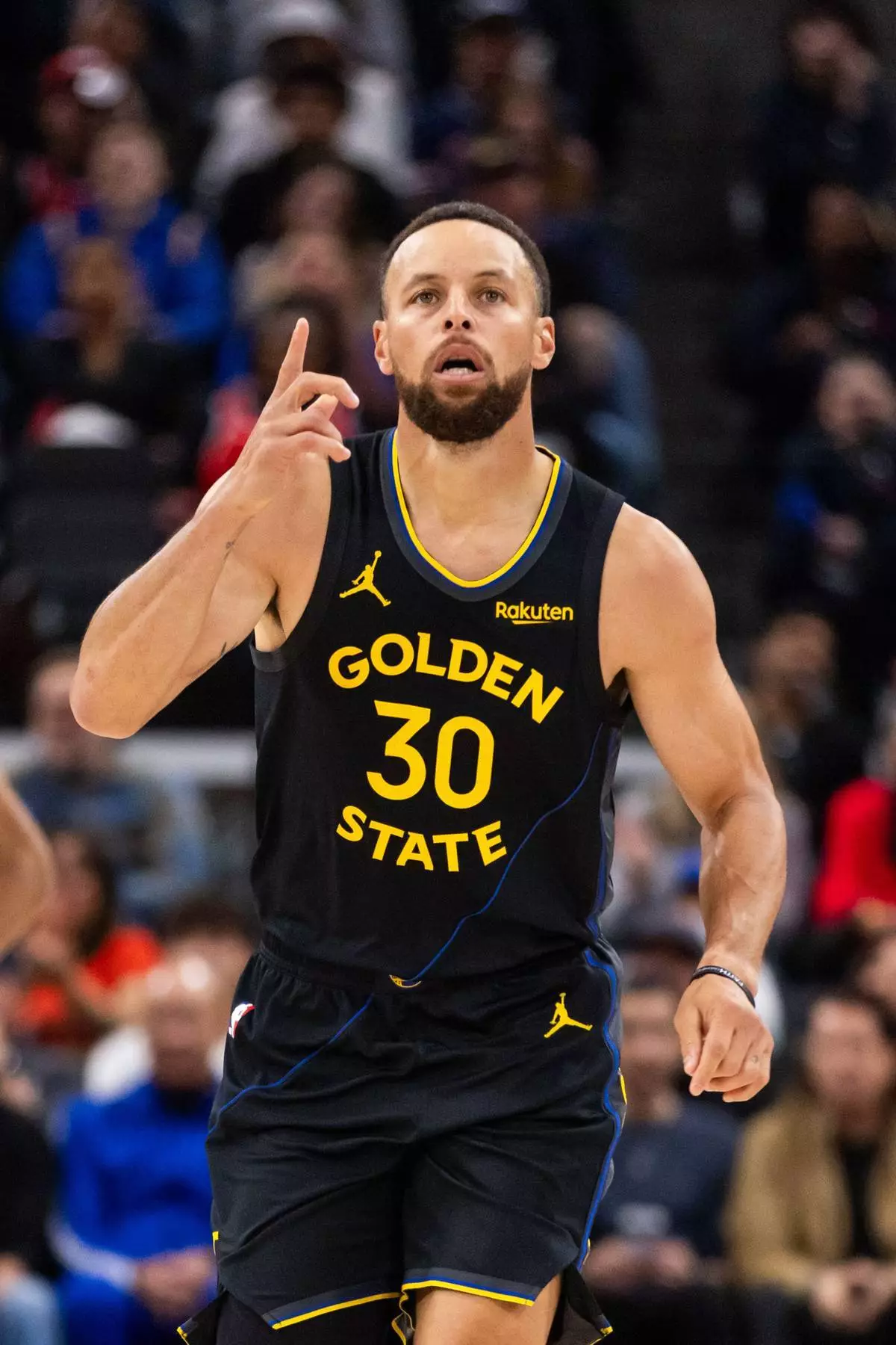金州勇士後衛史提芬居里在2026年4月12日周日於加州英格爾伍德舉行的一場NBA籃球賽上半場,對陣洛杉磯快艇得分後作出手勢。(美聯社圖片/Ethan Swope) AP圖片