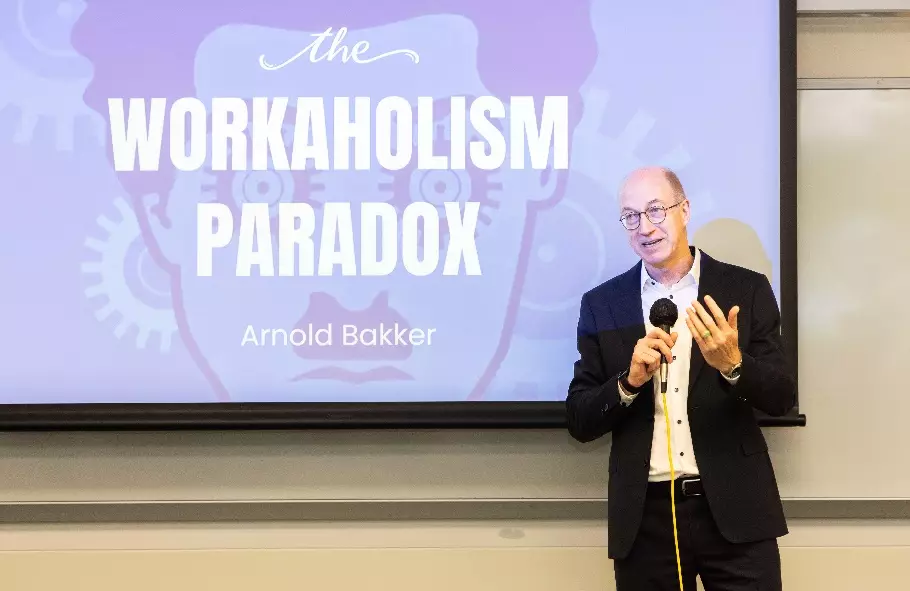 最新加盟「嶺南高等研究院」嶺南院士的國際知名組織心理學家,來自鹿特丹伊拉斯姆斯大學的阿諾德·巴克教授(Arnold Bakker)發表主題演講,探討了「工作狂悖論」,講解強迫性地過度投入工作不僅會消耗個人專注力、判斷力和正向情緒,更會降低創造力和工作表現。
