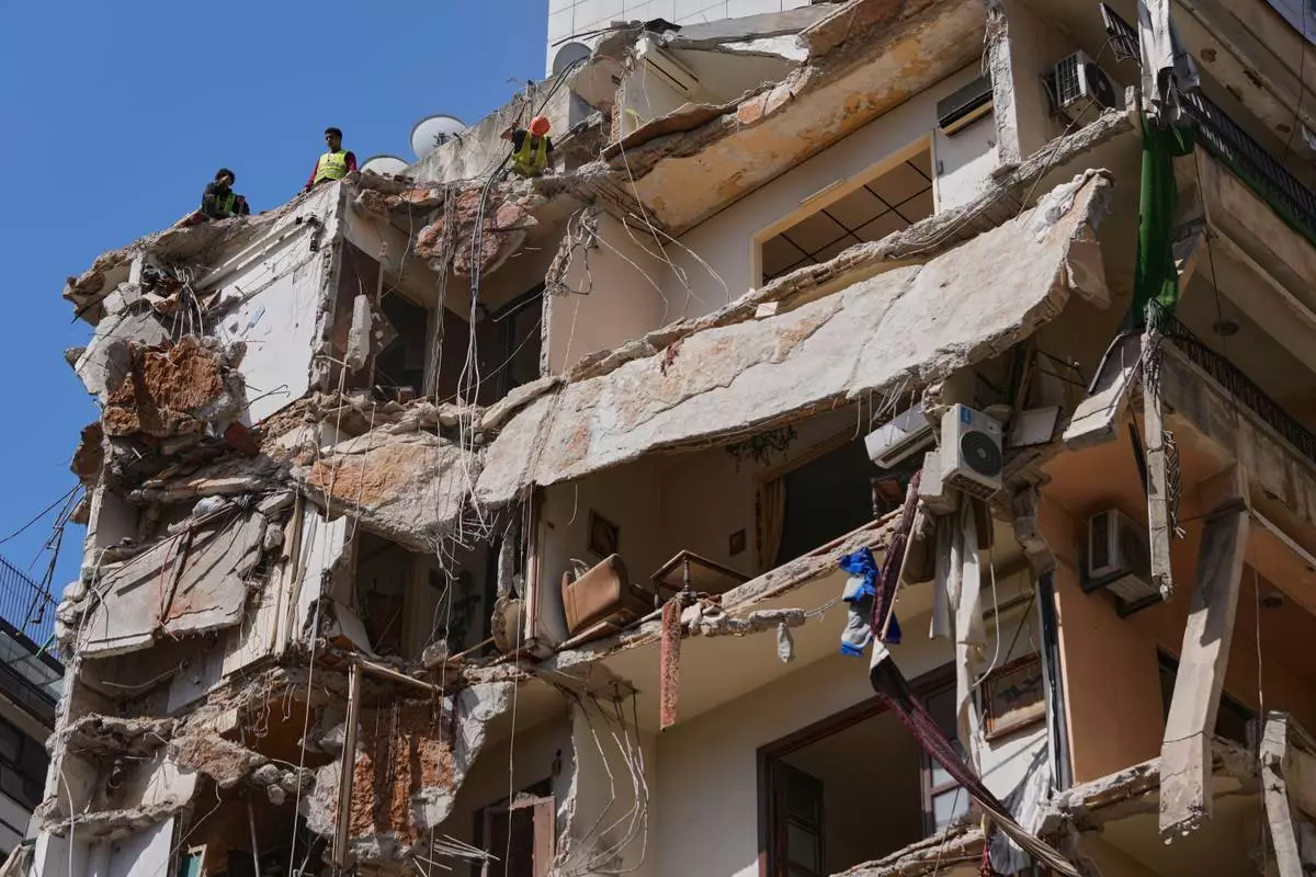 2026年4月13日周一,黎巴嫩貝魯特,救援人員在一個於4月8日遭以色列空襲摧毀的建築物內,移走瓦礫並繼續搜尋一名失蹤婦女及女童的遺體。(美聯社圖片/Hussein Malla) AP圖片