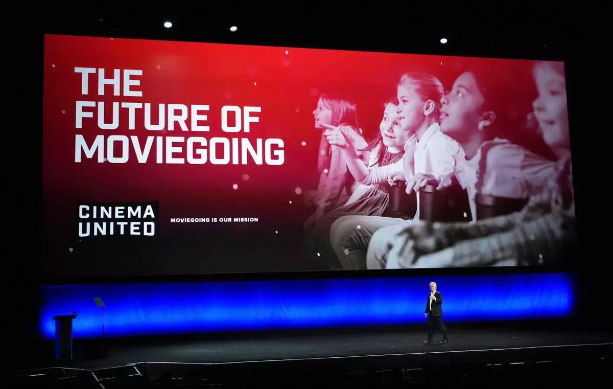 檔案圖片:2025年4月2日,出席電影產業大會(CinemaCon)的人士走過電影聯合會(Cinema United)的廣告牌。(美聯社圖片/Chris Pizzello) AP圖片