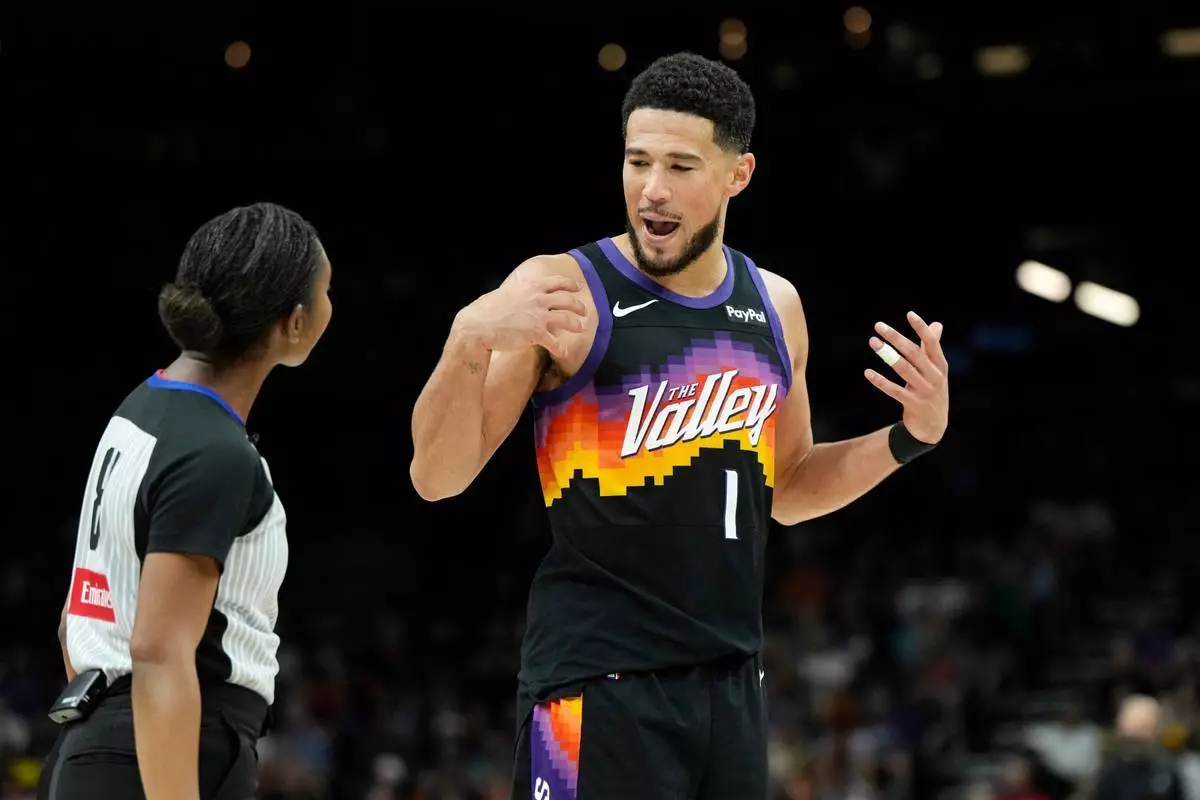 鳳凰城太陽(Phoenix Suns)後衛戴雲布加(Devin Booker)(1號)在2026年4月8日(周三)於鳳凰城舉行的一場NBA籃球賽下半場,與球證丹妮爾史葛(Danielle Scott)交談。 (美聯社圖片/Ross D. Franklin) AP圖片
