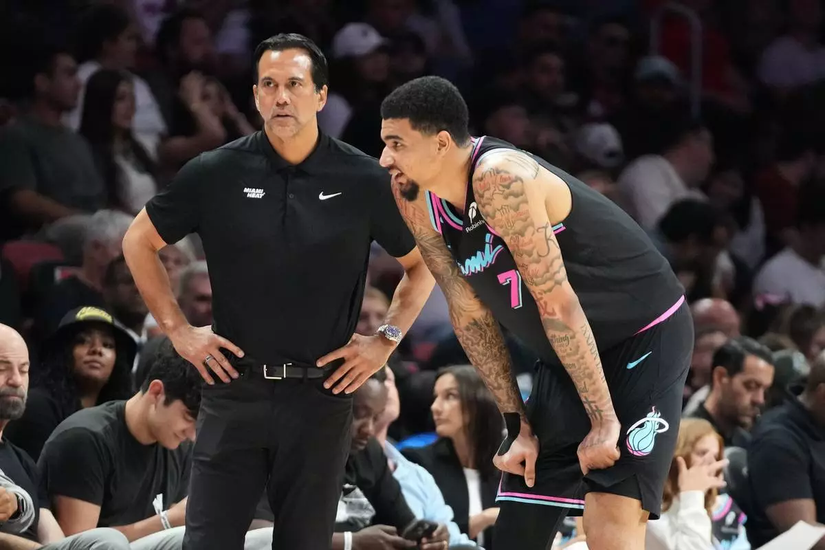 邁阿密熱火(Miami Heat)主教練史普斯杜拉(Erik Spoelstra)在2026年4月4日(周六)於邁阿密舉行的一場NBA籃球賽下半場,聆聽中鋒Kel'el Ware(7號)的說話。 (美聯社圖片/Marta Lavandier) AP圖片