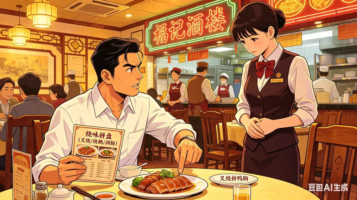 消費者在A中菜館點選餐牌上標價198元的粵式燒味拼盤,圖片顯示包含乳豬、燒鵝、燻蹄、海蜇及切雞五款食材;惟上菜後僅切雞及海蜇相符,其餘三項竟被牛腩、鴨胸肉及青瓜取代,差異明顯。投訴人即向職員查詢,對方僅稱餐牌已註明「圖片僅供參考」,未作進一步解釋。