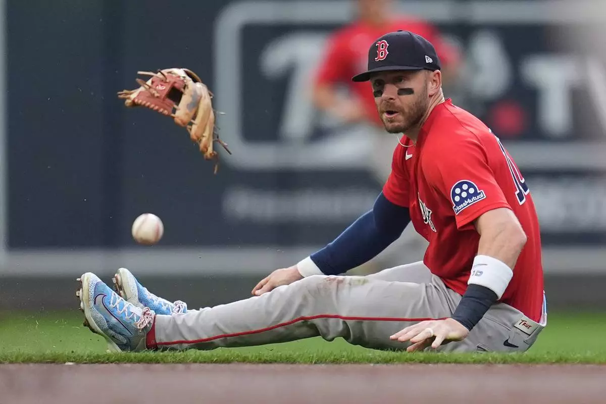 波士頓紅襪游擊手特雷弗·史托利(Trevor Story)於2026年4月13日周一在明尼阿波利斯對陣明尼蘇達雙城的棒球比賽第一局中,嘗試接住明尼蘇達雙城布魯克斯·李(Brooks Lee)擊出的內野安打。(美聯社圖片/Abbie Parr) AP圖片