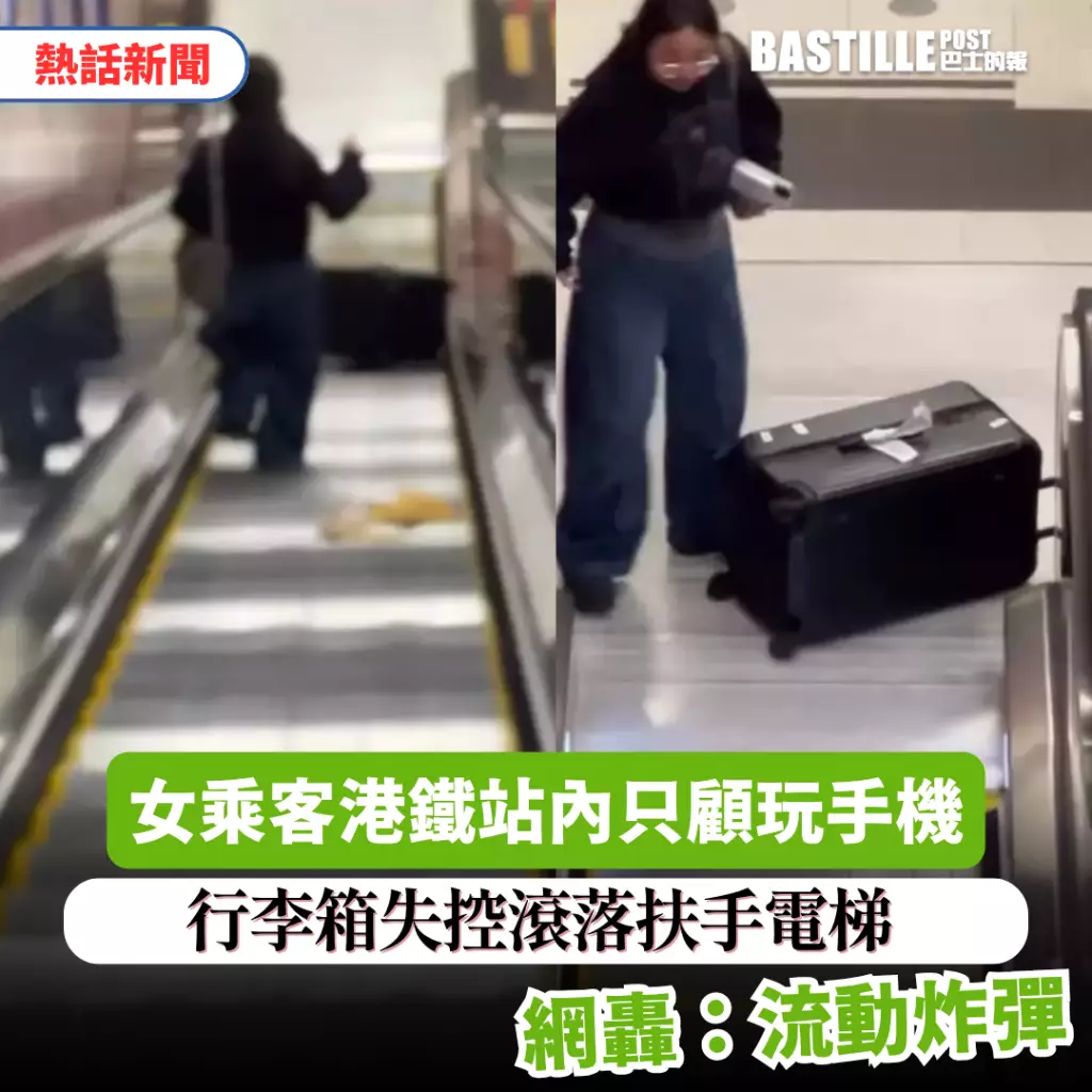 日前在紅磡港鐵站內,一名女乘客的驚險一幕被網民拍下並在社交平台Threads上瘋傳。影片中,該名女子拖著一個黑色行李箱,卻在搭乘扶手電梯時只顧低頭玩手機,完全沒有留意身邊的行李。結果,行李箱瞬間失控,沿著電梯一路高速滾落至地面,險象環生。