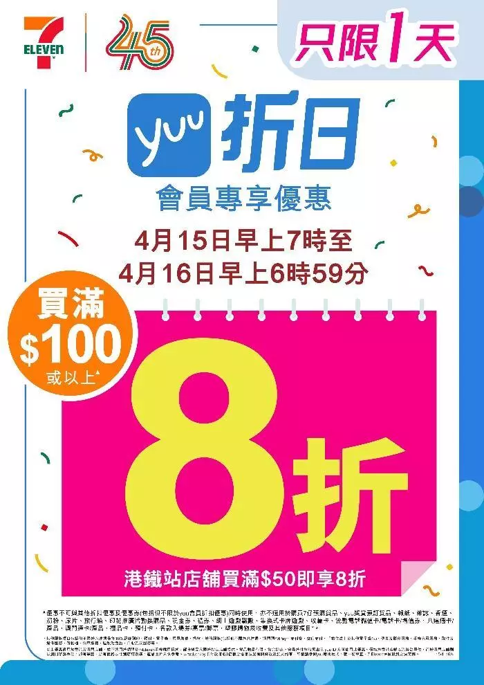 7-Eleven 45 周年限定 yuu 折日震撼登場,各位 yuu 會員於 4 月 15 日早上 7 時起到 7-Eleven 購物滿 $100* 或到港鐵站店舖購物滿 $50^,即享 8 折優惠!同時,優惠更延長至 4 月 16 日早上 6 時 59 分#,一連串著數登場,讓大家無論日夜都可以盡情掃貨,同賀 7-Eleven 45 周年!