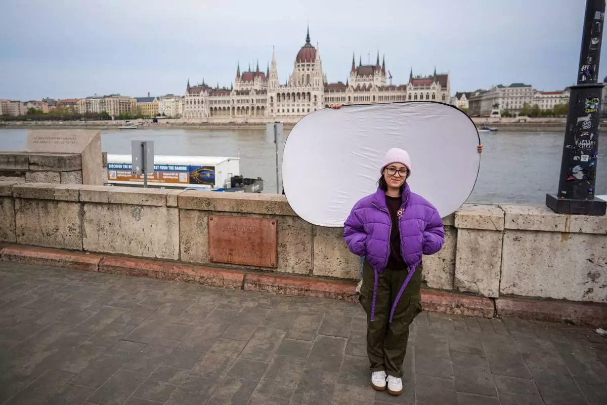 24歲的埃斯特爾·庫利塞克·M(Eszter Kulisek M.)於2026年4月13日周一在匈牙利布達佩斯以國會大廈為背景拍攝肖像。「我希望年輕人開始參與社會;他們在政治上會更積極,他們會承擔我們的日常挑戰。」(美聯社圖片/Petr David Josek) AP圖片