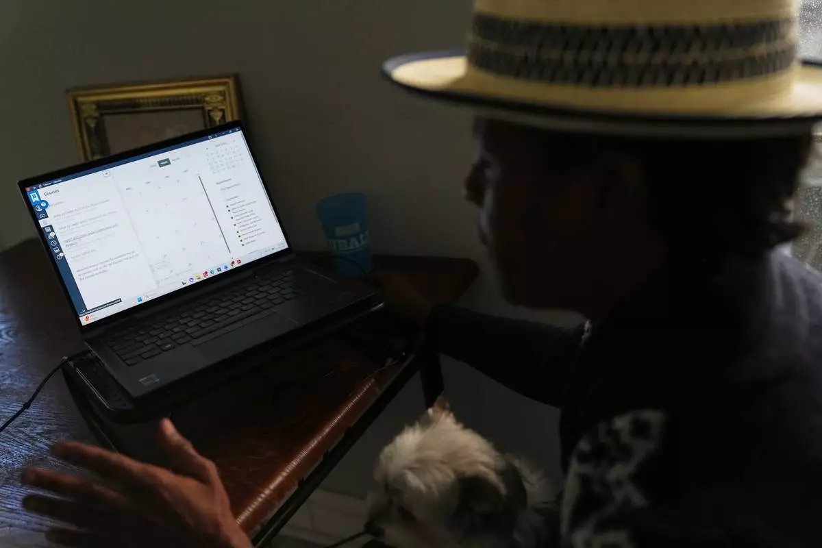 巴爾的摩大學學生耶禾娜安德森(Jevona Anderson)於2026年4月7日周二在巴爾的摩家中審閱網上功課。(美聯社圖片/Stephanie Scarbrough) AP圖片