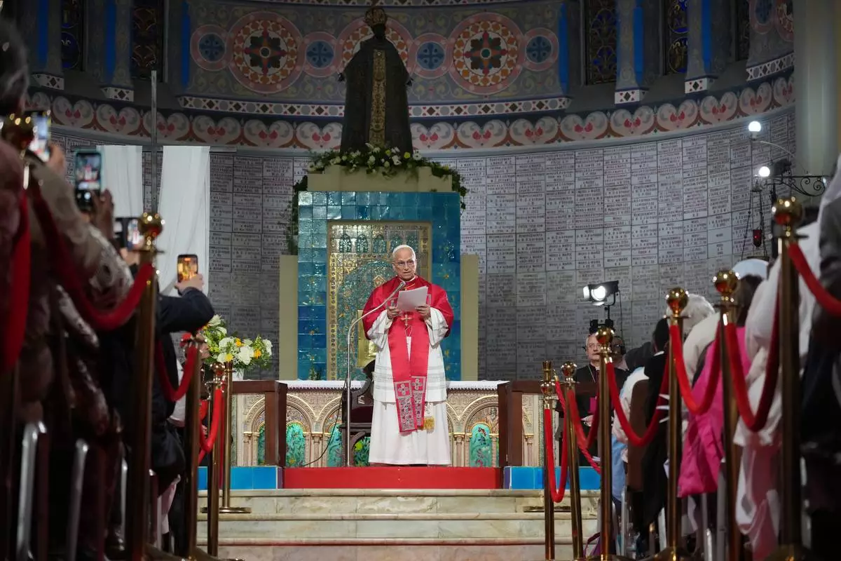 教宗良十四世(Pope Leo XIV)於2026年4月13日周一在阿爾及爾(Algiers)非洲聖母宗座聖殿(Basilica of Our Lady of Africa)會見阿爾及利亞社群,展開為期11天的非洲牧靈之旅首日行程。(美聯社圖片/Andrew Medichini) AP圖片