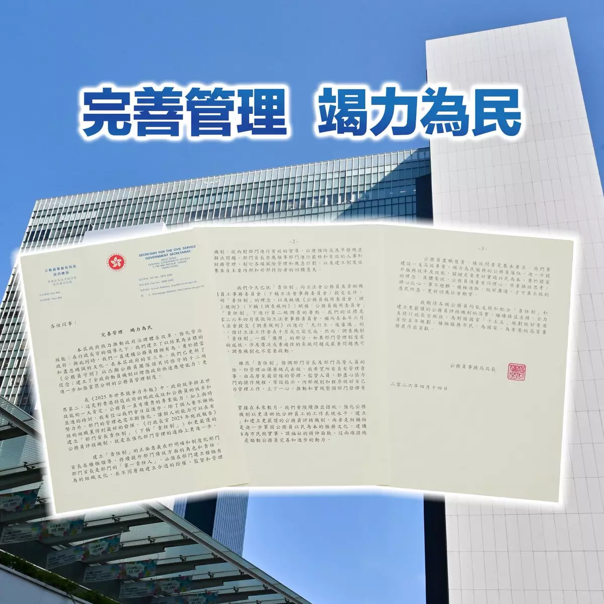 文件強調,部門首長應營造「以結果為目標」及「以民為本」的組織文化,確保部門擁有健全的管理體系,包括操作規程、內部準則和風險管理計劃,並定期審查以適應變化。公務員事務局已於25年10月向各部門首長提示相關要求。