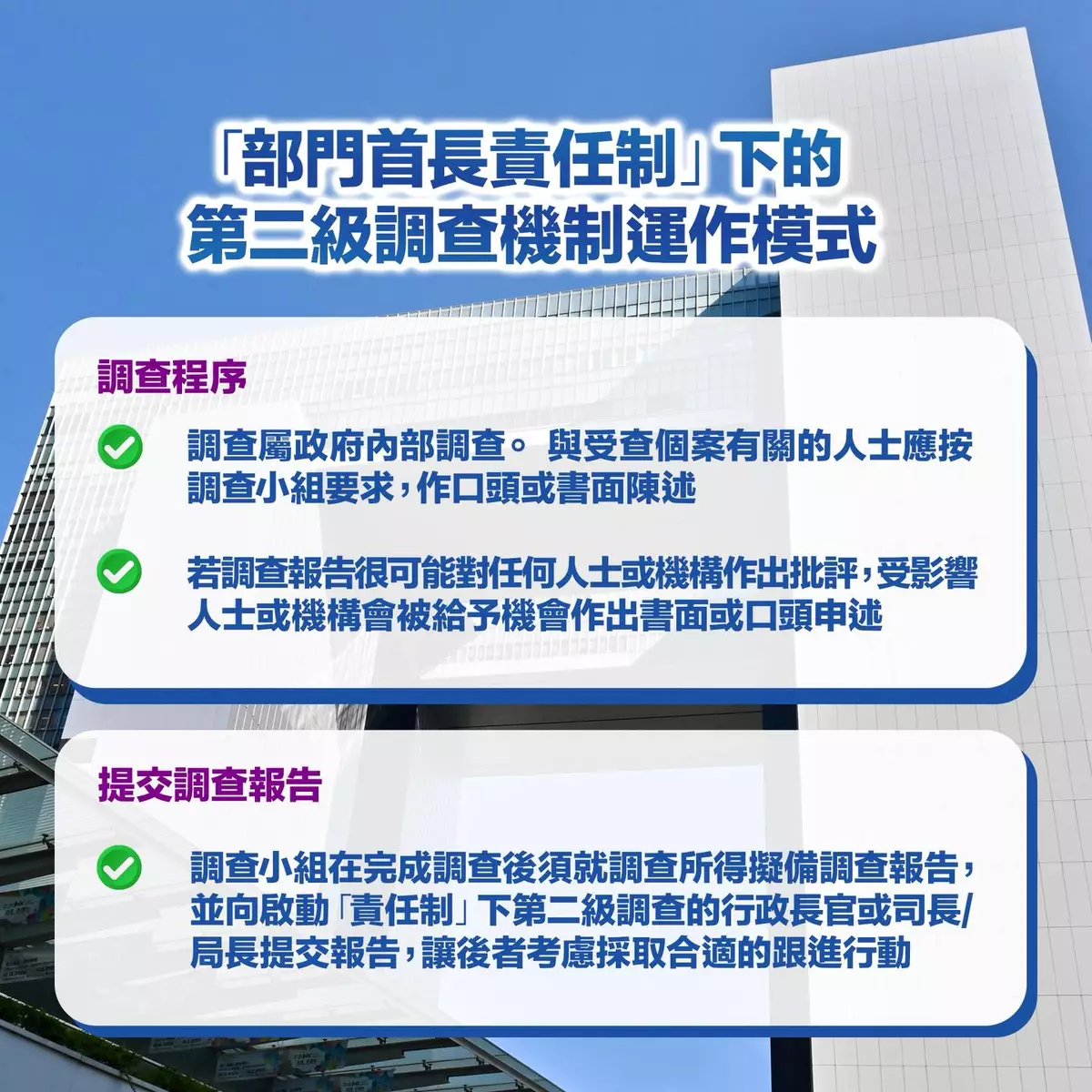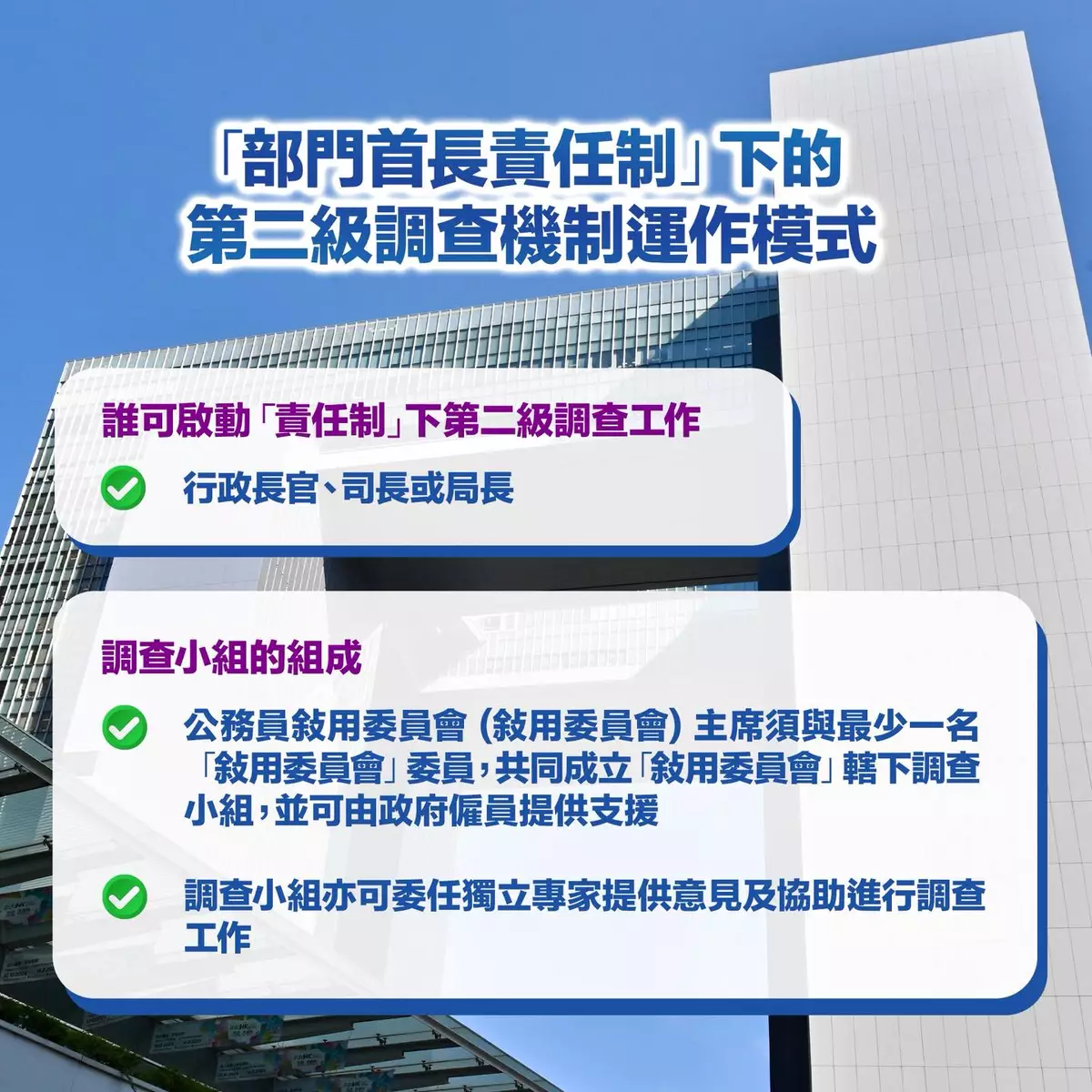 第一級調查適用於問題性質較不嚴重、屬單一事件或牽涉執行層人員的情況,由部門首長負責調查及跟進。第二級調查則針對涉及嚴重問題、廣泛或重複性系統問題,或有跡象顯示可能涉及部門首長角色的情況,由行政長官、司長或局長啟動,交由公務員敍用委員會領導的調查小組進行。
