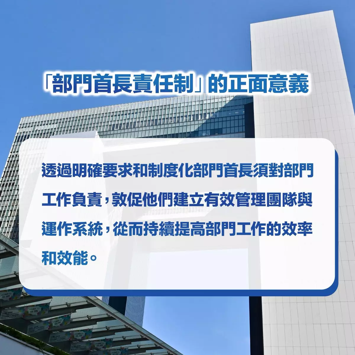 據了解,「責任制」的核心是明確和制度化部門首長在積極領導、持續提升部門績效方面的角色和責任。部門首長須親自深入瞭解部門各項服務,特別是基本服務和關鍵職務的運作;並在不同層級建立合適的授權、監督和管理機制,對員工進行有效督導,以便及早發現和解決問題。