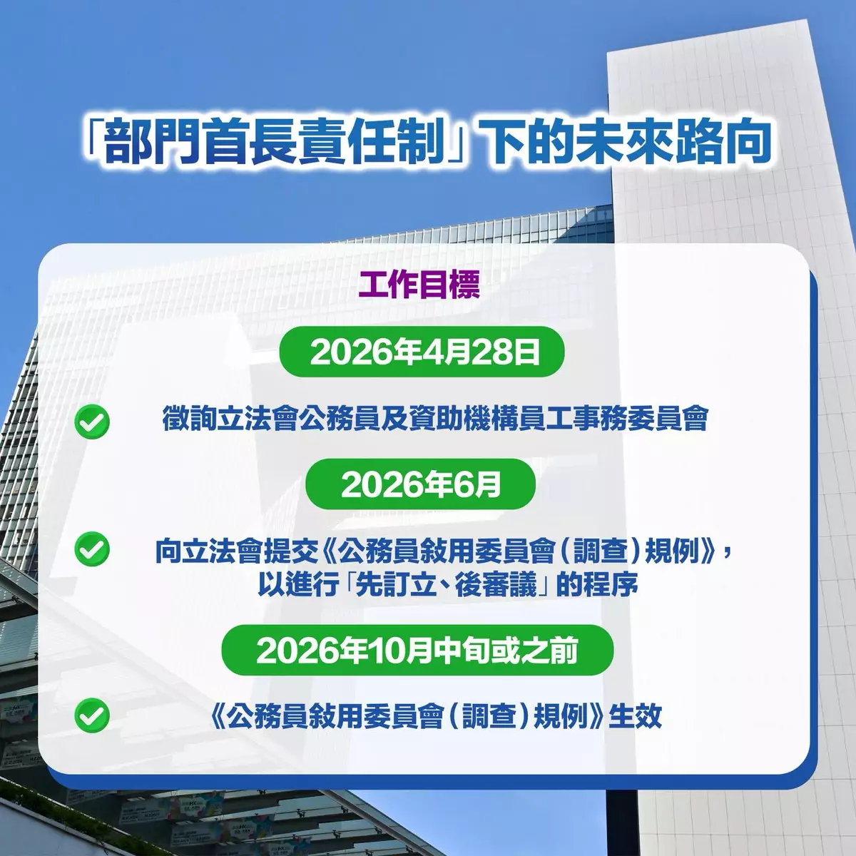 政府計劃6月向立法會提交《公務員敍用委員會(調查)規例》以落實「部門首長責任制」,以「先訂立、後審議」程序進行審議,預計新例最遲10月中旬生效。