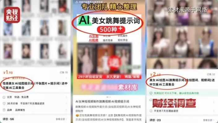 據《央視財經》調查報道,多個網絡平台上充斥公開兜售AI製作色情影音教程的賣家,以「AI製作美女影片」、「全網最強大尺度」、「AI擦邊賽道日入5位數」的標題,再配上色情露骨的畫面,號稱只需一張圖片、幾句話,便能以低至9.9元人民幣,買一組「提示詞」,輕鬆生成大尺度露骨影片,更有人以「日入五位數」招徠,形成一條集教學、販賣提示詞、軟件引流的黃色產業鏈。