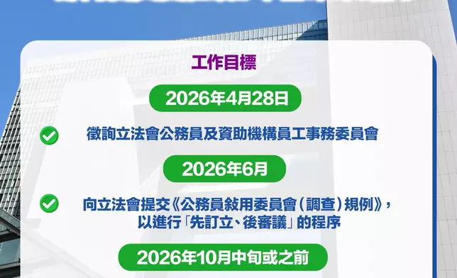 公務員事務局將先於4月28日,向立法會公務員及資助機構員工事務委員會提交討論文件,詳細介紹「部門首長責任制」的理念、調查機制運作模式,以及擬議《公務員敍用委員會(調查)規例》的主要內容。