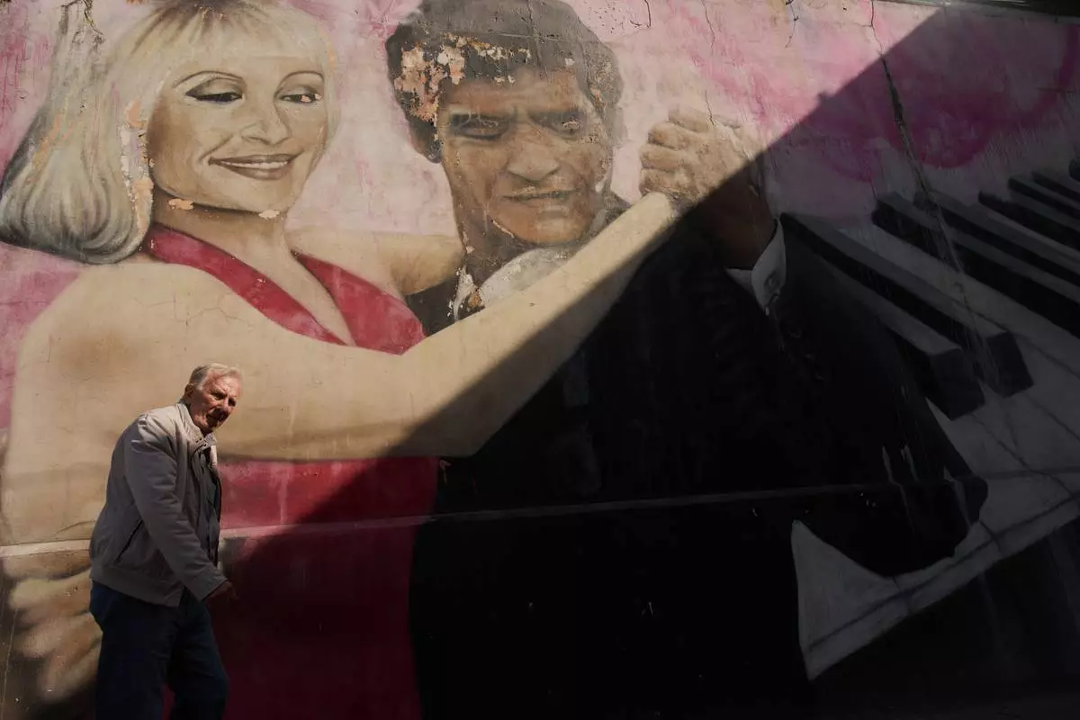 2026年4月13日周一,一名男子走過阿根廷布宜諾斯艾利斯(Buenos Aires)一幅由藝術家塞加托里(Alfredo Segatori)繪製的壁畫,畫中描繪已故足球傳奇馬勒當拿(Diego Maradona)與意大利歌手卡拉(Raffaella Carra)跳探戈。(美聯社圖片/Rodrigo Abd) AP圖片