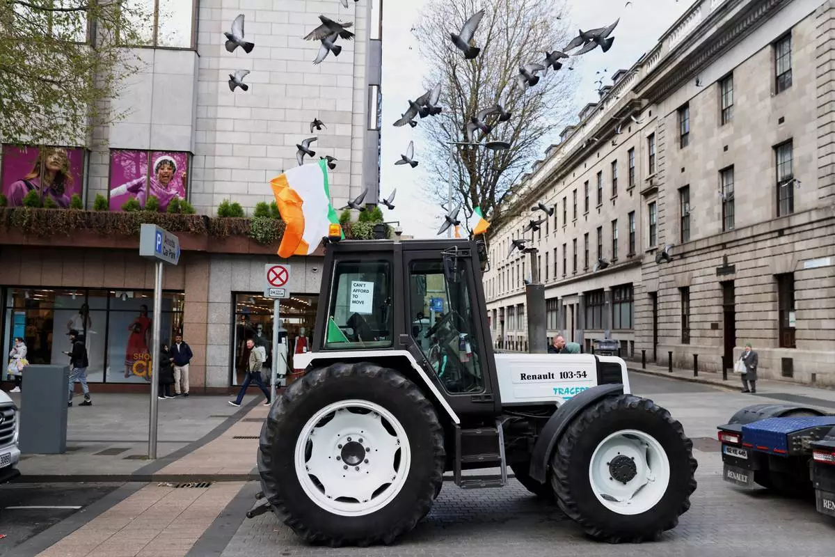 2026年4月11日周六,在全國燃油示威的第五天,拖拉機堵塞愛爾蘭都柏林奧康奈爾街(O'Connell Street)。 (美聯社圖片/Peter Morrison) AP圖片